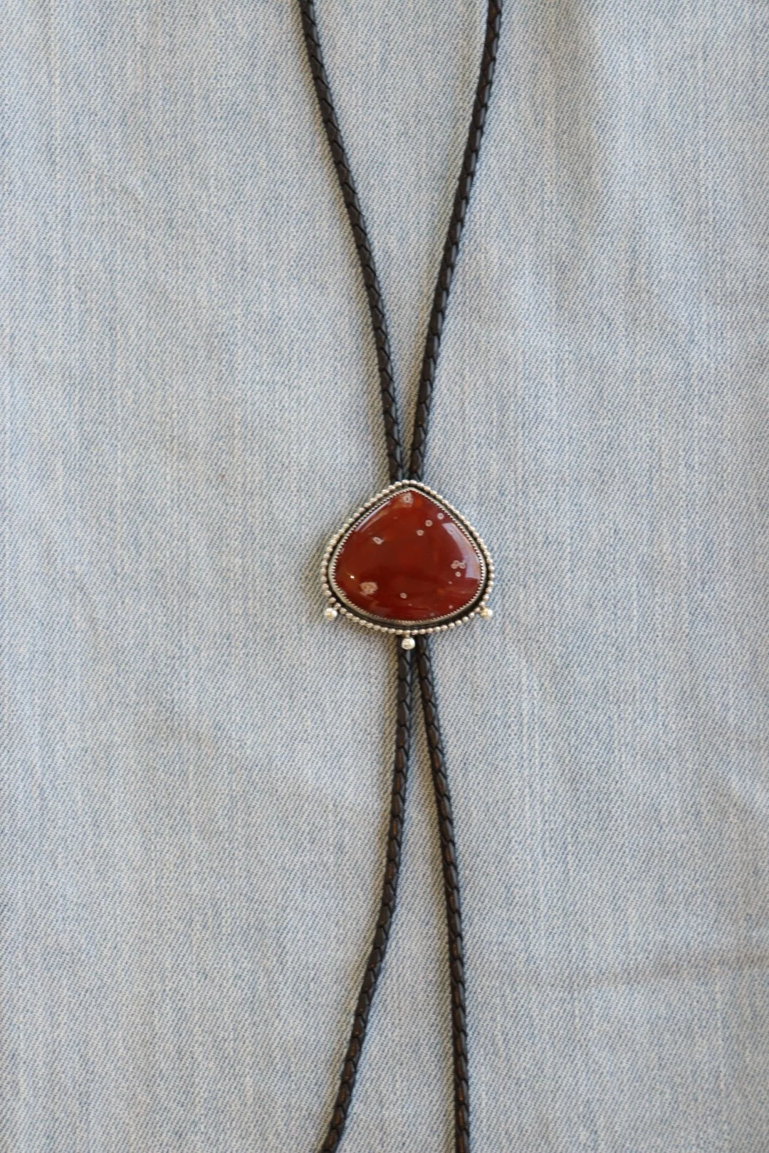.925 Sterling Silver bolo tie featuring natural carnelian, set on a black leather cord. A modern take on a classic style, handcrafted, bold, and easy to wear.